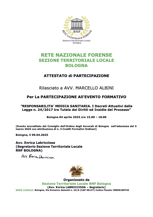 L’aggiornamento professionale continuo è garanzia di conoscenza dettagliata della normativa e della giurisprudenza in continua evoluzione in tale complessa materia, ovvero di un’assistenza professionalmente accreditata e qualificata (* attestati di partecipazione a convegni di aggiornamento professionale in materia di risarcimento danni da malasanità).